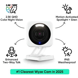 Upgrade your home monitoring with the Wyze Cam v4, a compact security camera that punches above its size. Capture crisp 2.5K QHD footage with an upgraded image processor and Wide Dynamic Range (WDR) for lifelike color in challenging lighting. After dark, Enhanced Color Night Vision keeps important details visible without blowing out highlights.